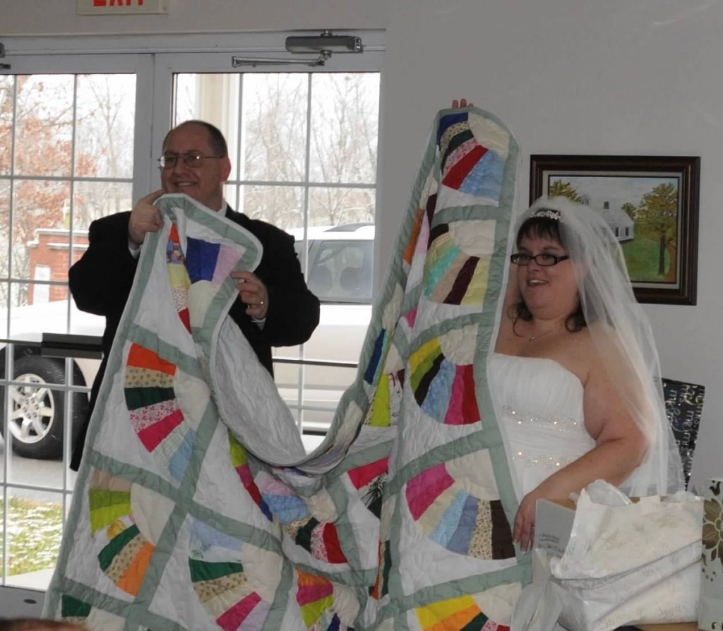 The second picture is from our wedding reception when we opened the quilt my mamaw made by hand.
