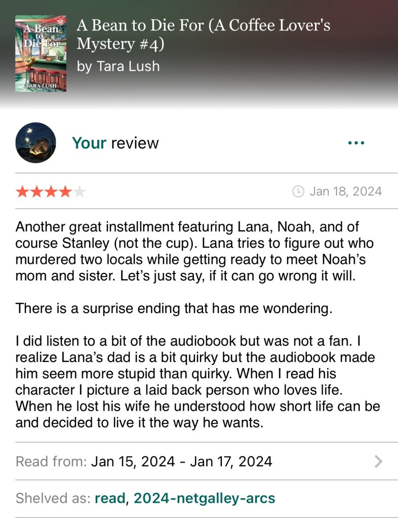 A Bean to Die For by Tara Lush January 18, 2024 / kentuckybooklover Share this: Click to share on X (Opens in new window) X Click to share on Facebook (Opens in new window) Facebook Like Loading... Related